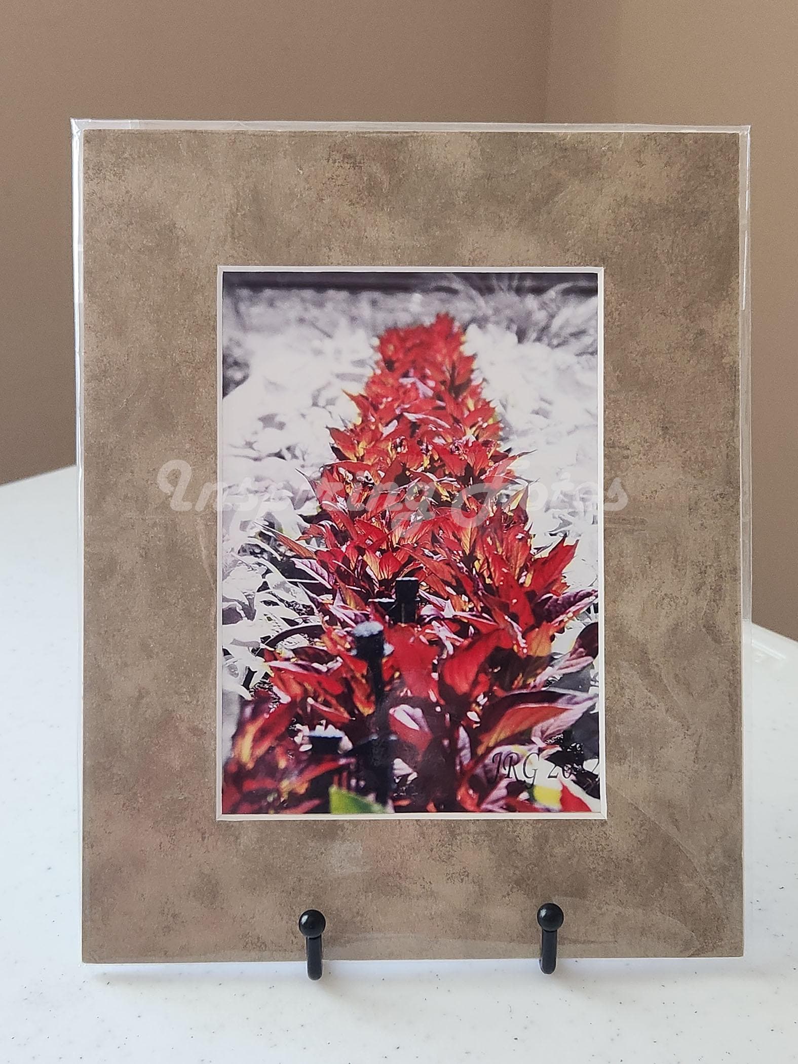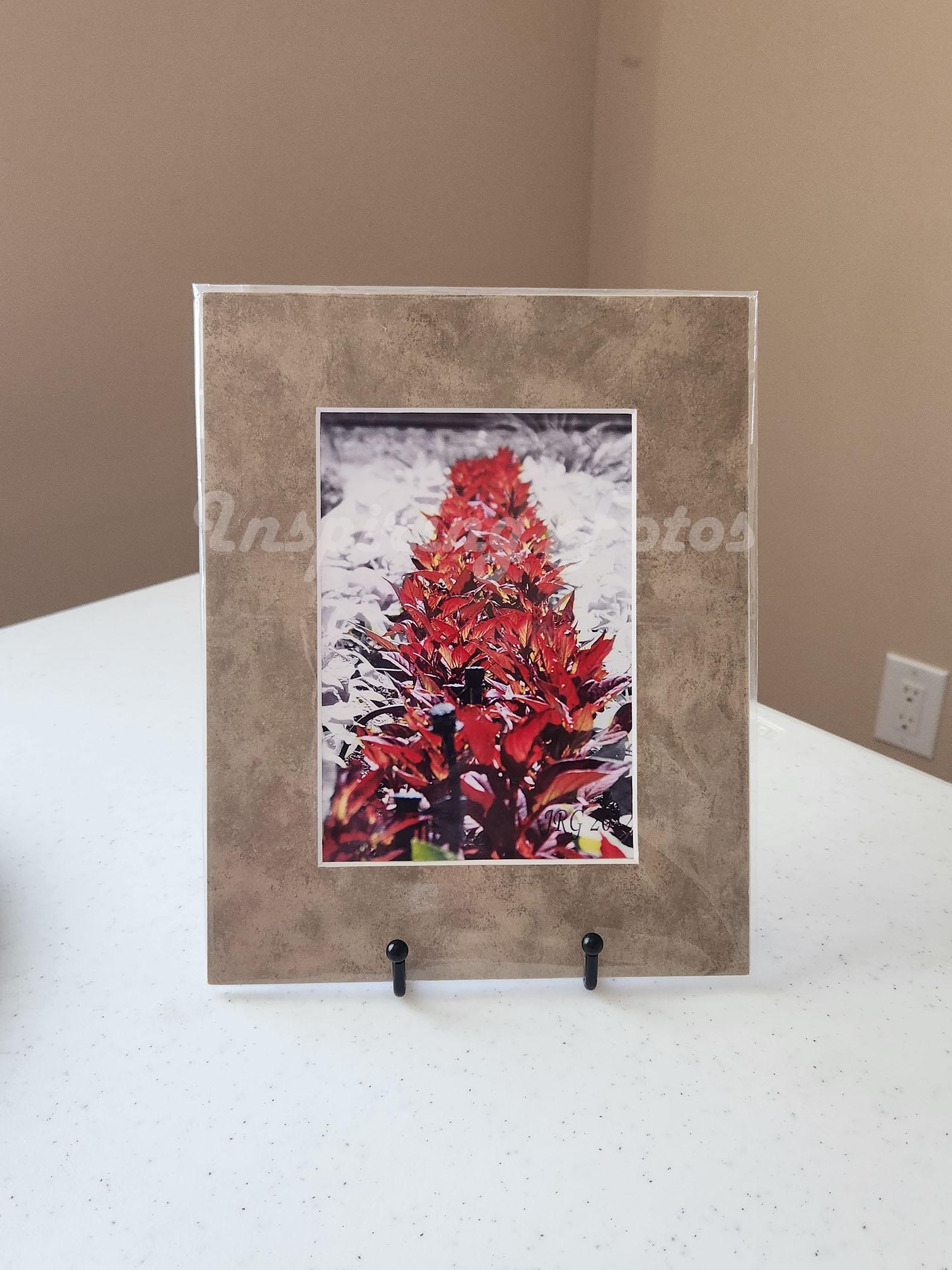 This 8 x 10-inch matted wall art is part of the Touch of Color collection. This 5 x 7-inch black and white photo with red color leaves in a matted frame was taken in Arizona. This is a perfect gift for friends or family members that loves a touch of color in their photo.