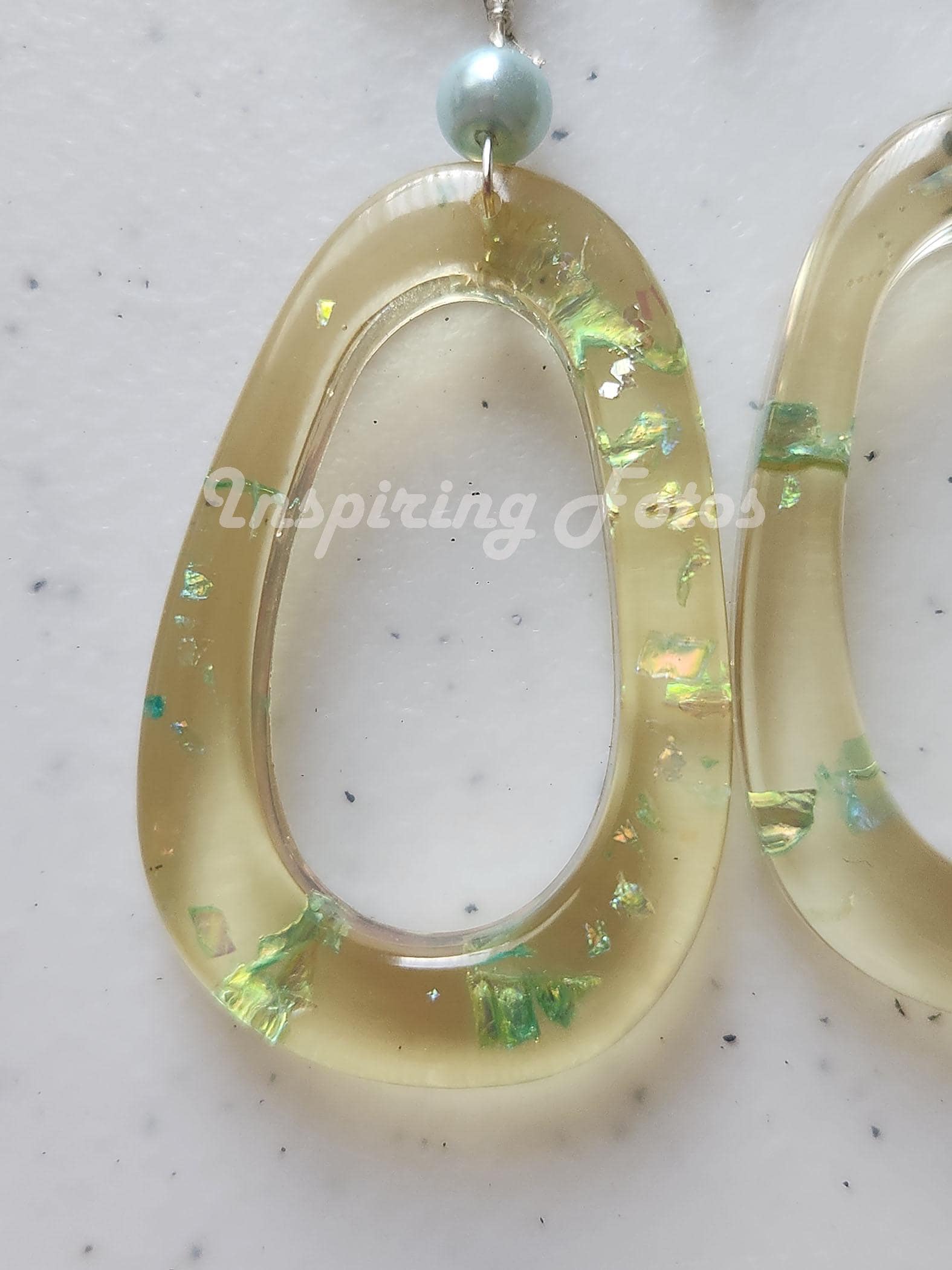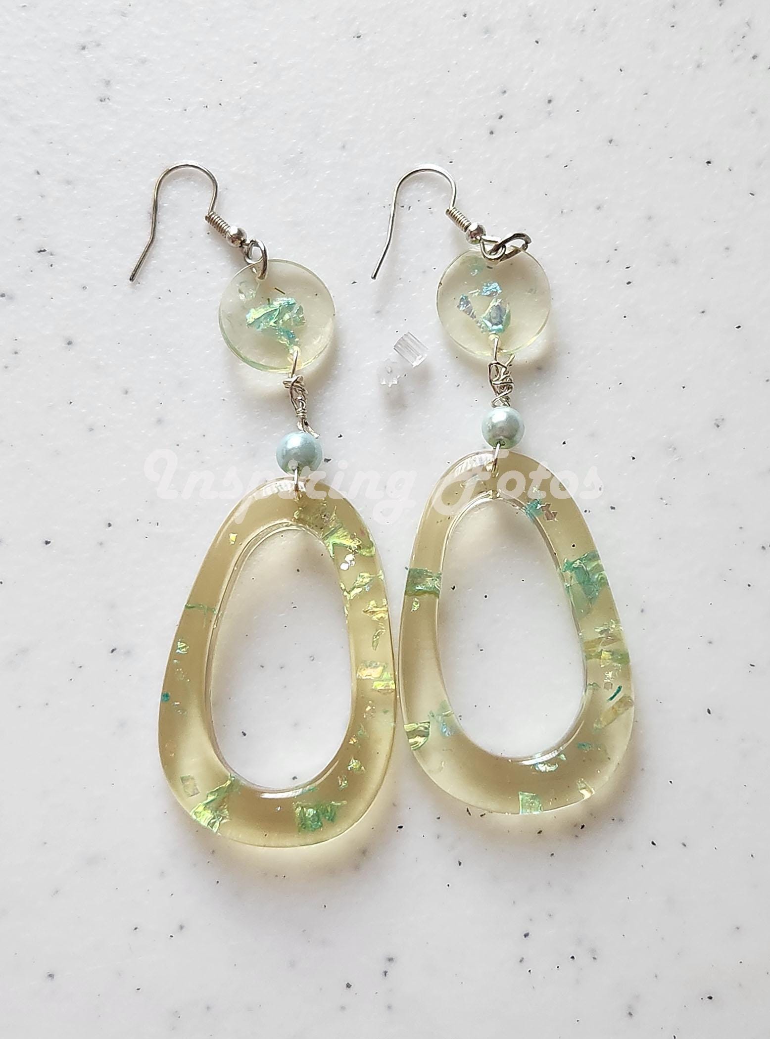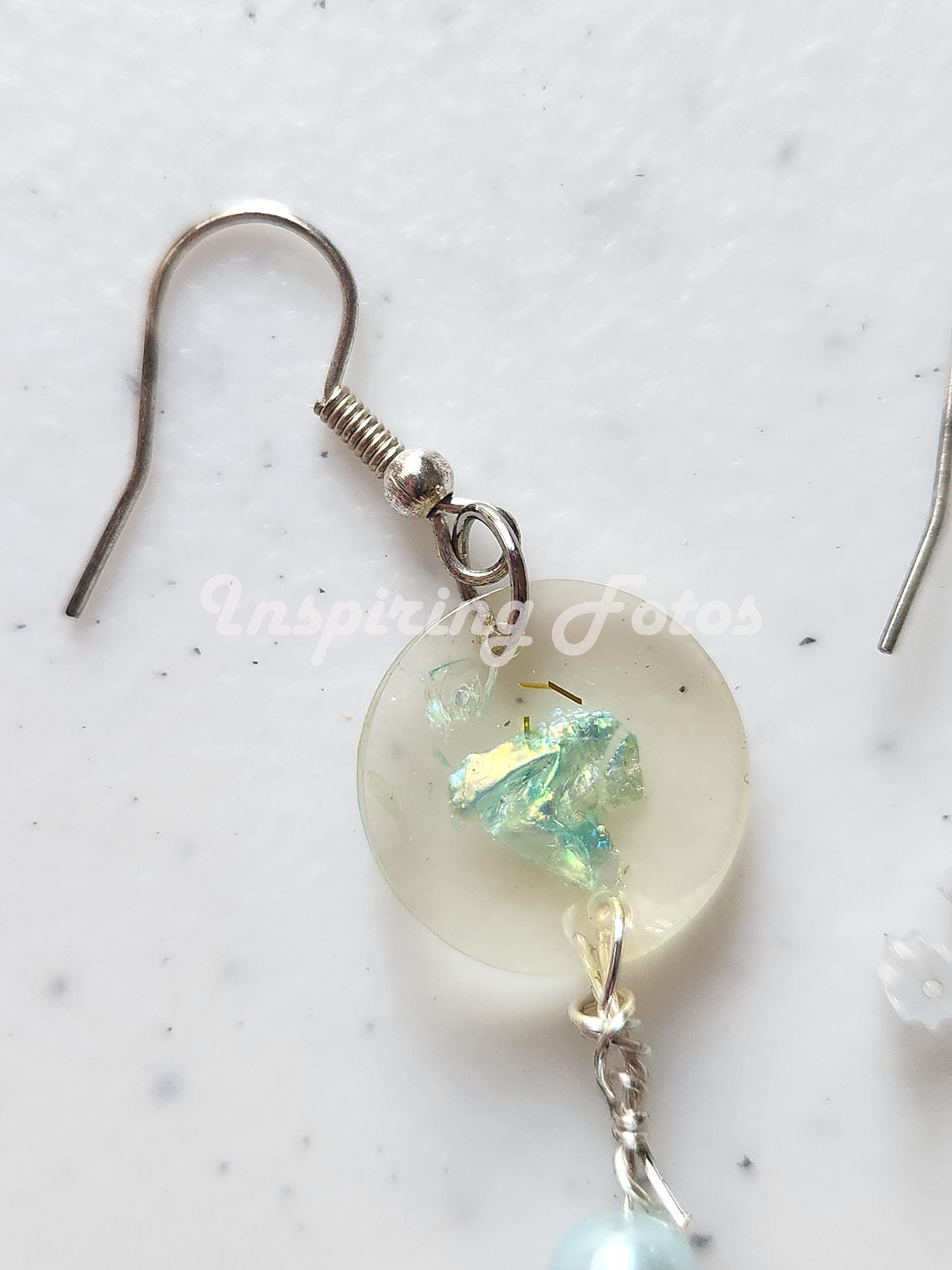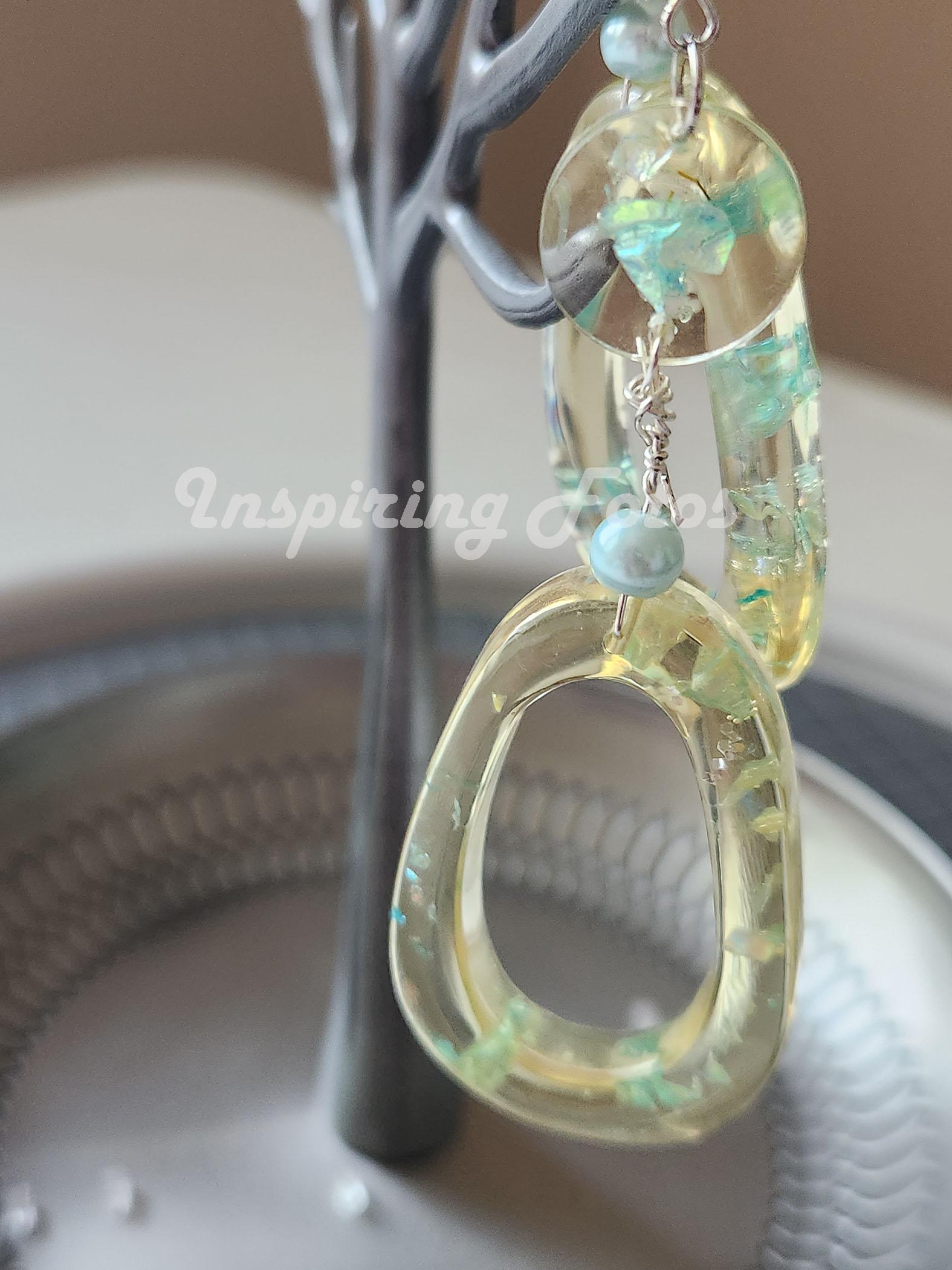 This resin oval pearl drop earrings are part of the Touch of Jewelry collection. The earrings are 3 1/2-inches dropped oval shape with blue sequin flakes and light blue glass pearl beads. Perfect gift for friends or family members for any occasion.