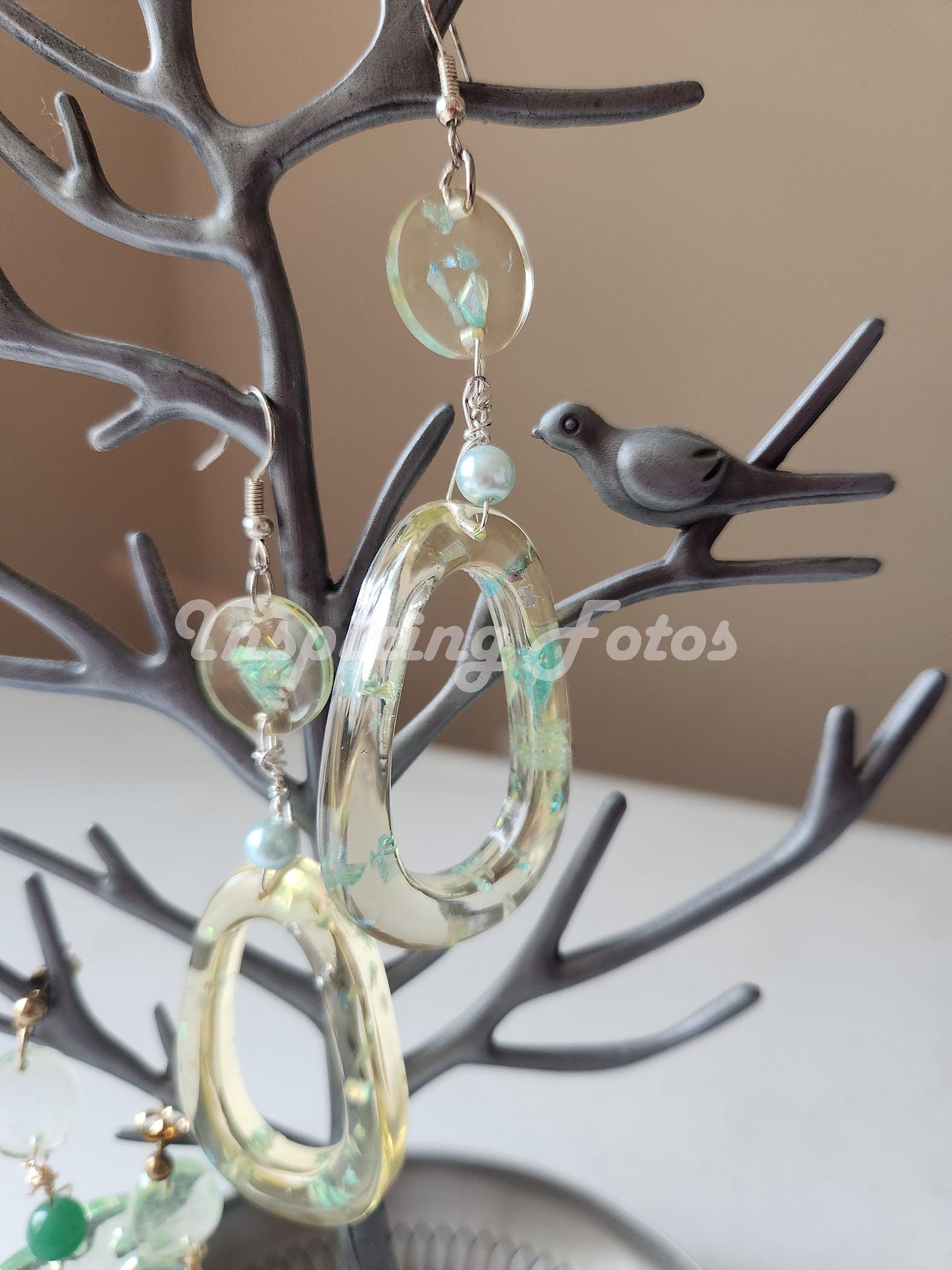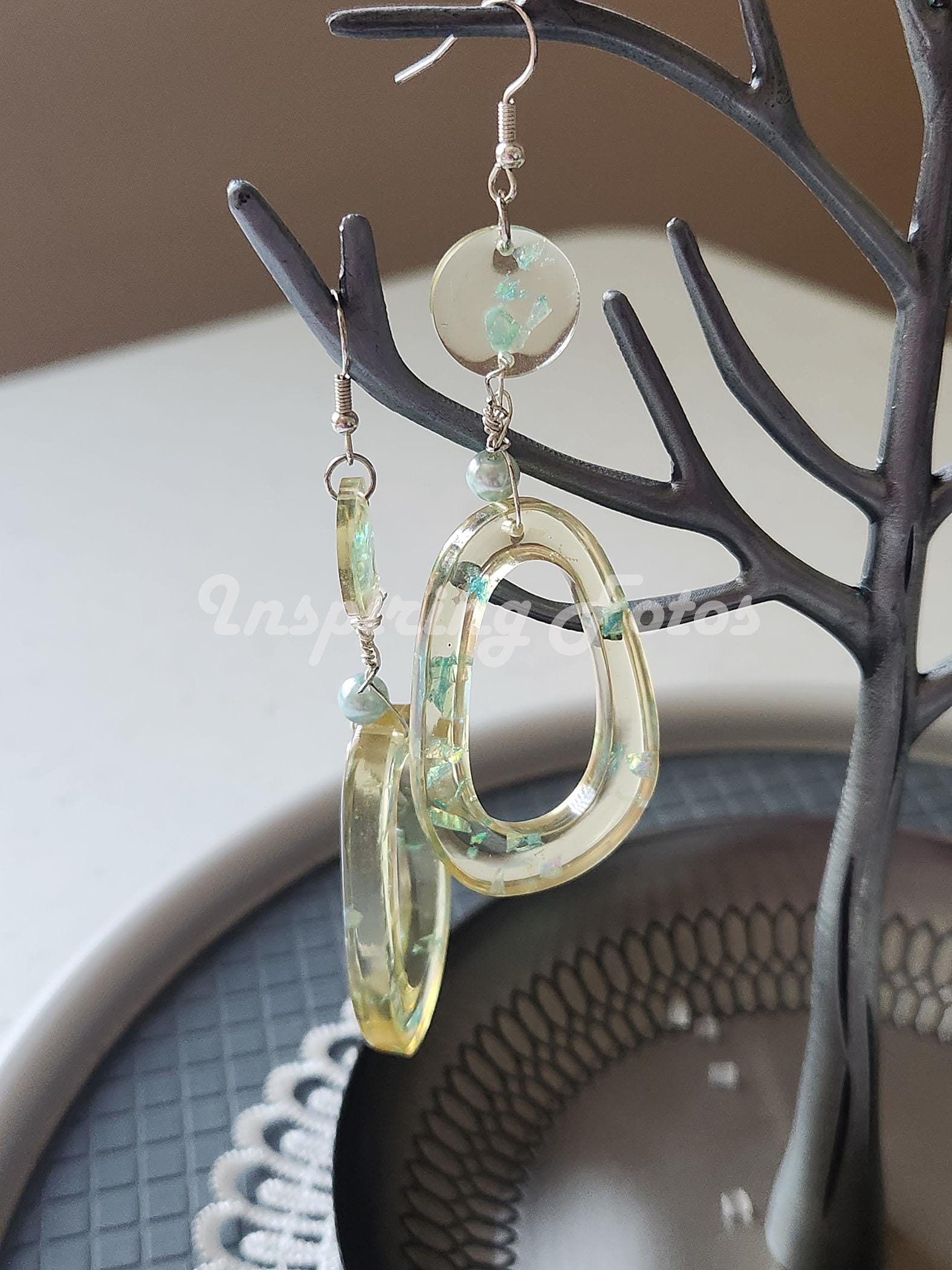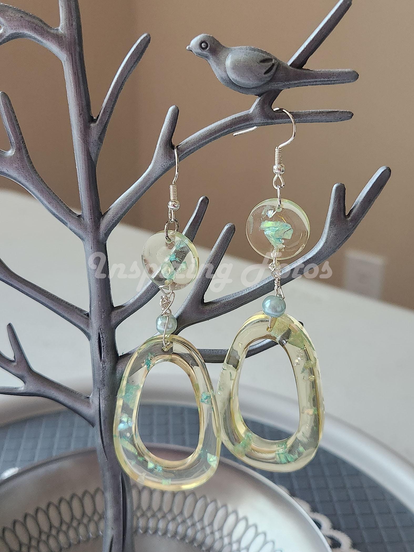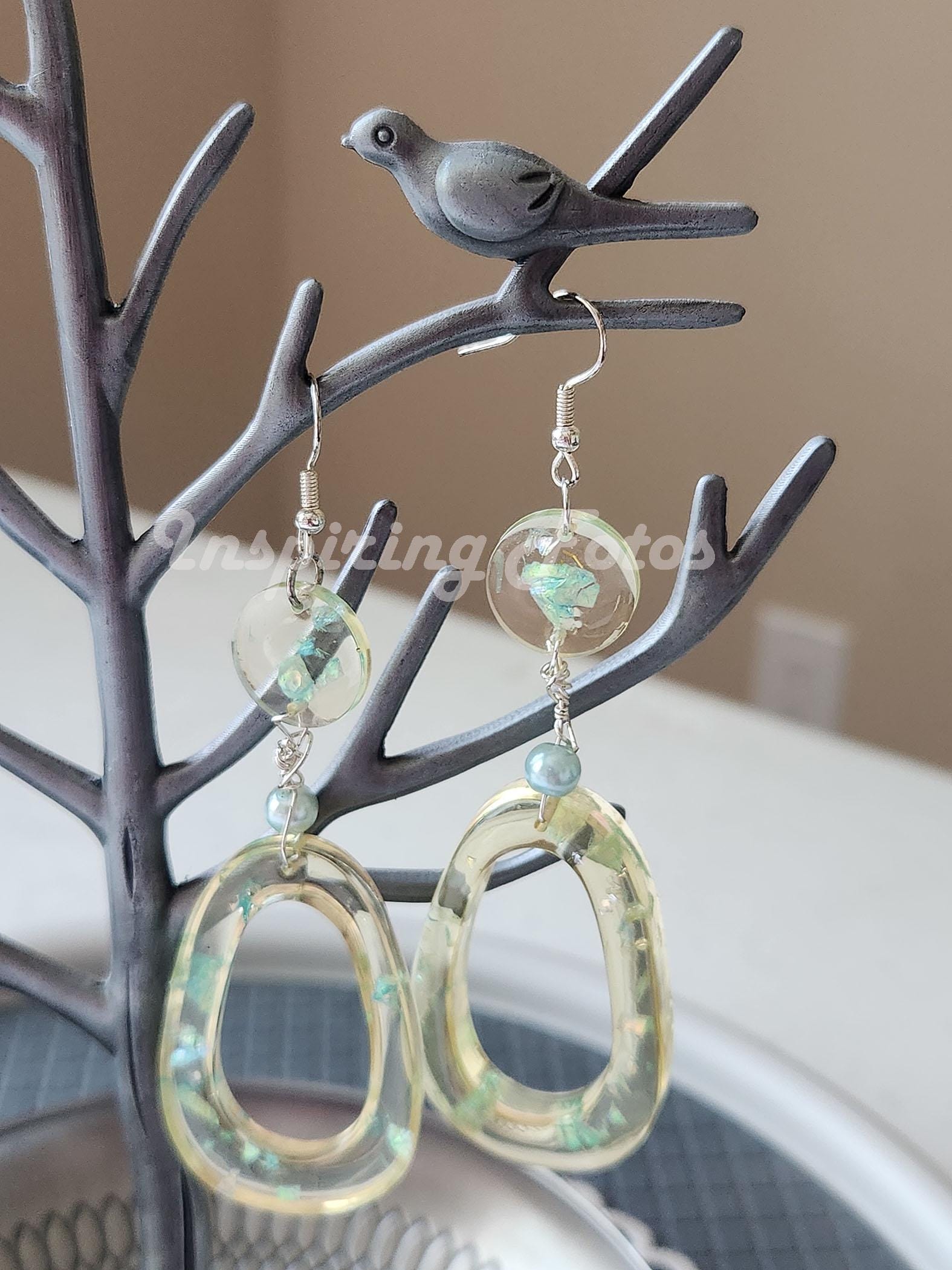 This resin oval pearl drop earrings are part of the Touch of Jewelry collection. The earrings are 3 1/2-inches dropped oval shape with blue sequin flakes and light blue glass pearl beads. Perfect gift for friends or family members for any occasion.