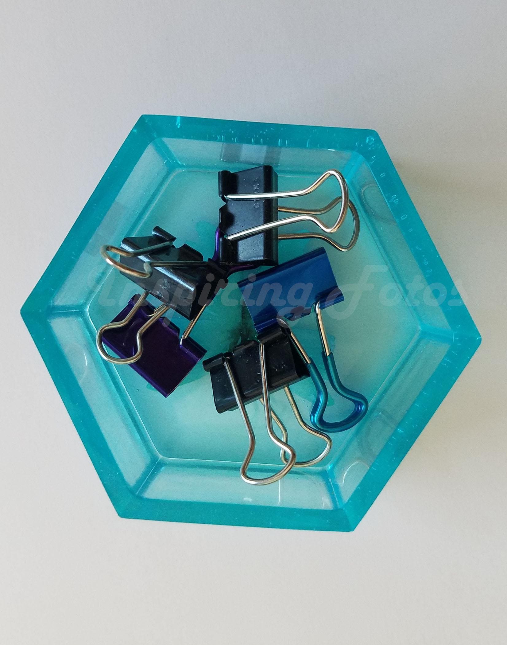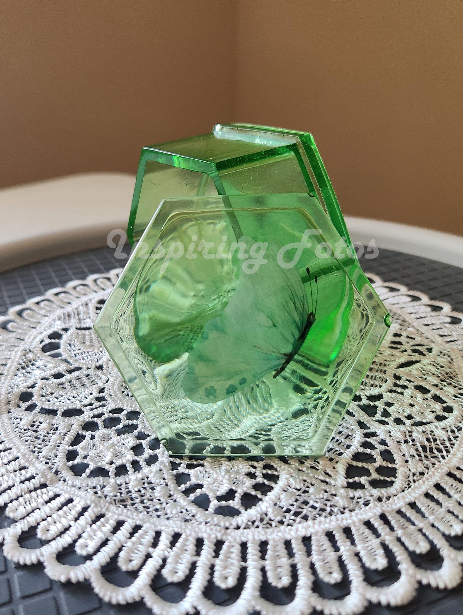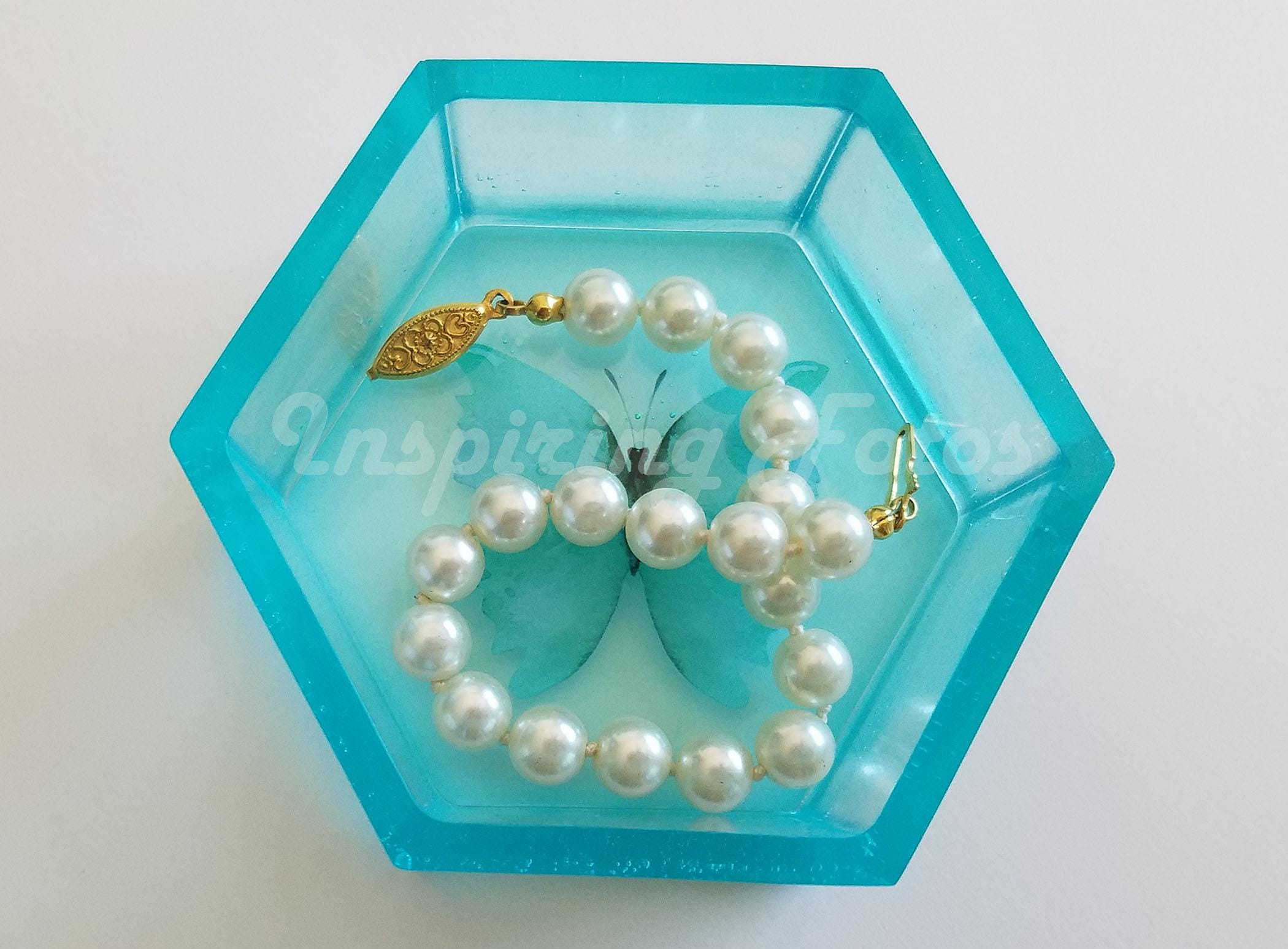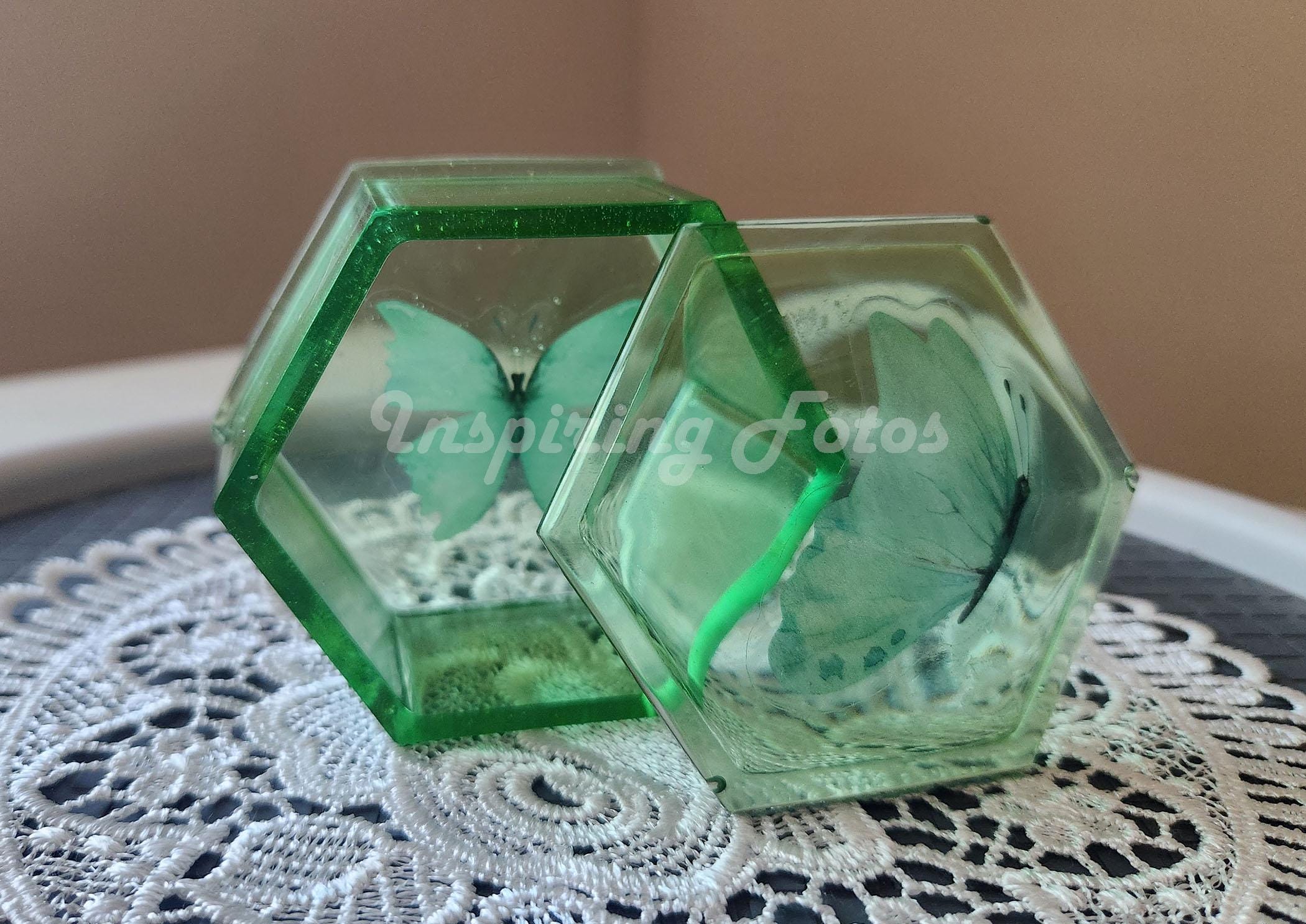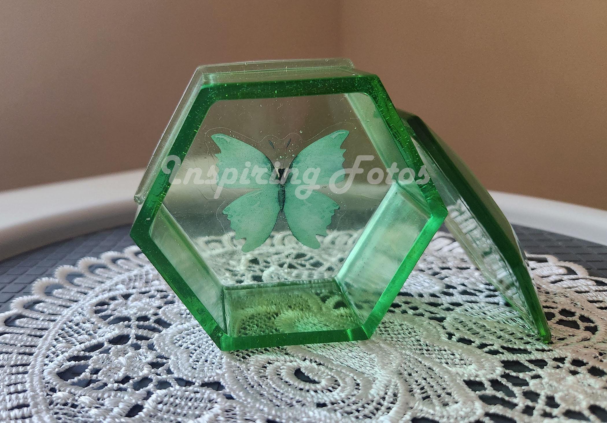 New Item: This resin trinket box is part of the Touch of Butterflies collection. This is a 3 x 3 x 1 1/2-inch hexagon blueish green (Sky Blue) in color resin trinket box with a butterfly decor. This is a perfect small box to store small jewelry or use on your desk to hold desk supplies such as paper clips, push pins or rubber bands,