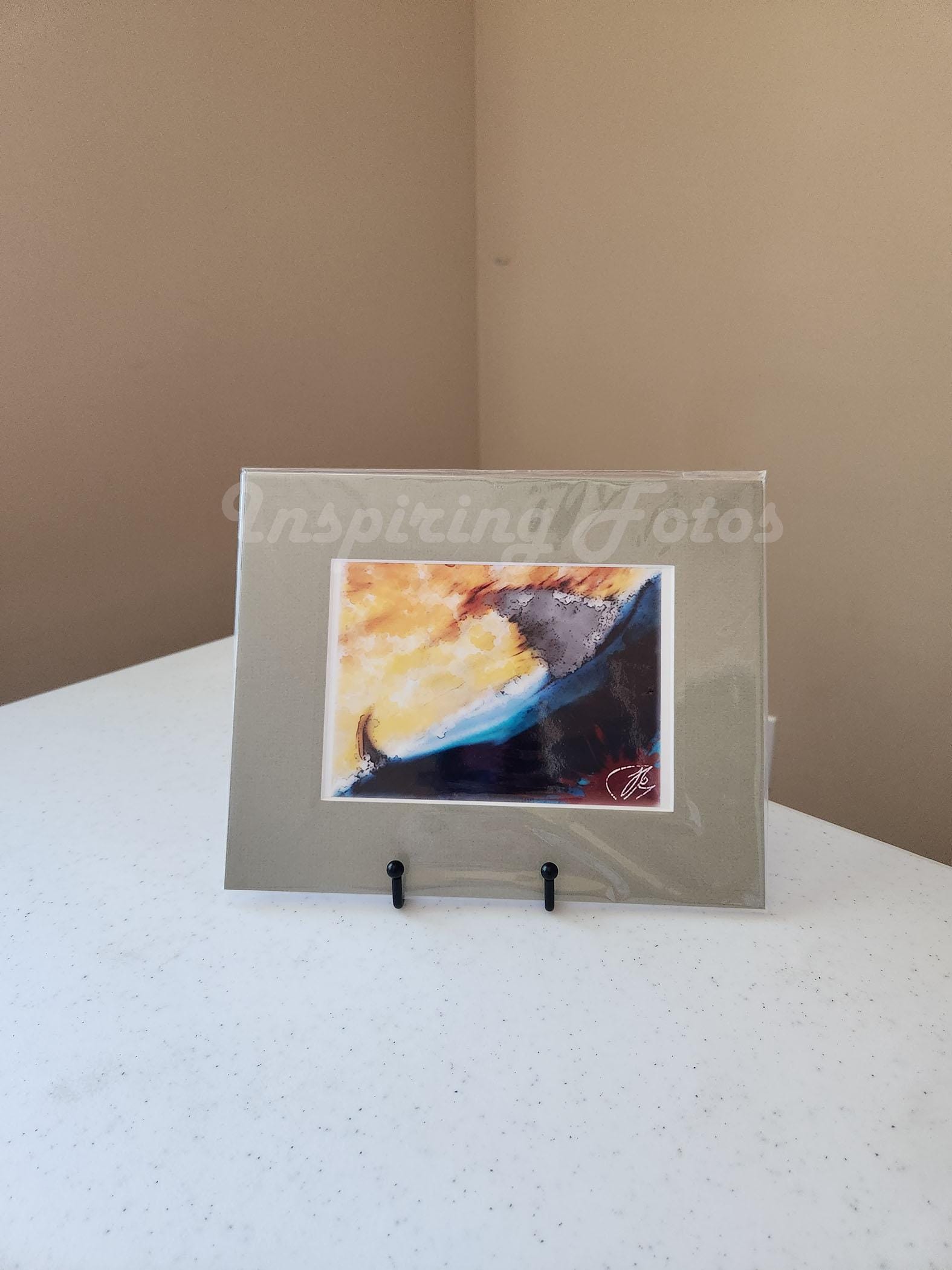This 8 x 10-inch matted wall art is part of the Touch of Digital collection. This is a 5 x 7-inch digital color photo of an abstract shark in an 8 x 10-inch green matted frame. "Shark Surf Postcard" is an original digitally painted abstract artwork.