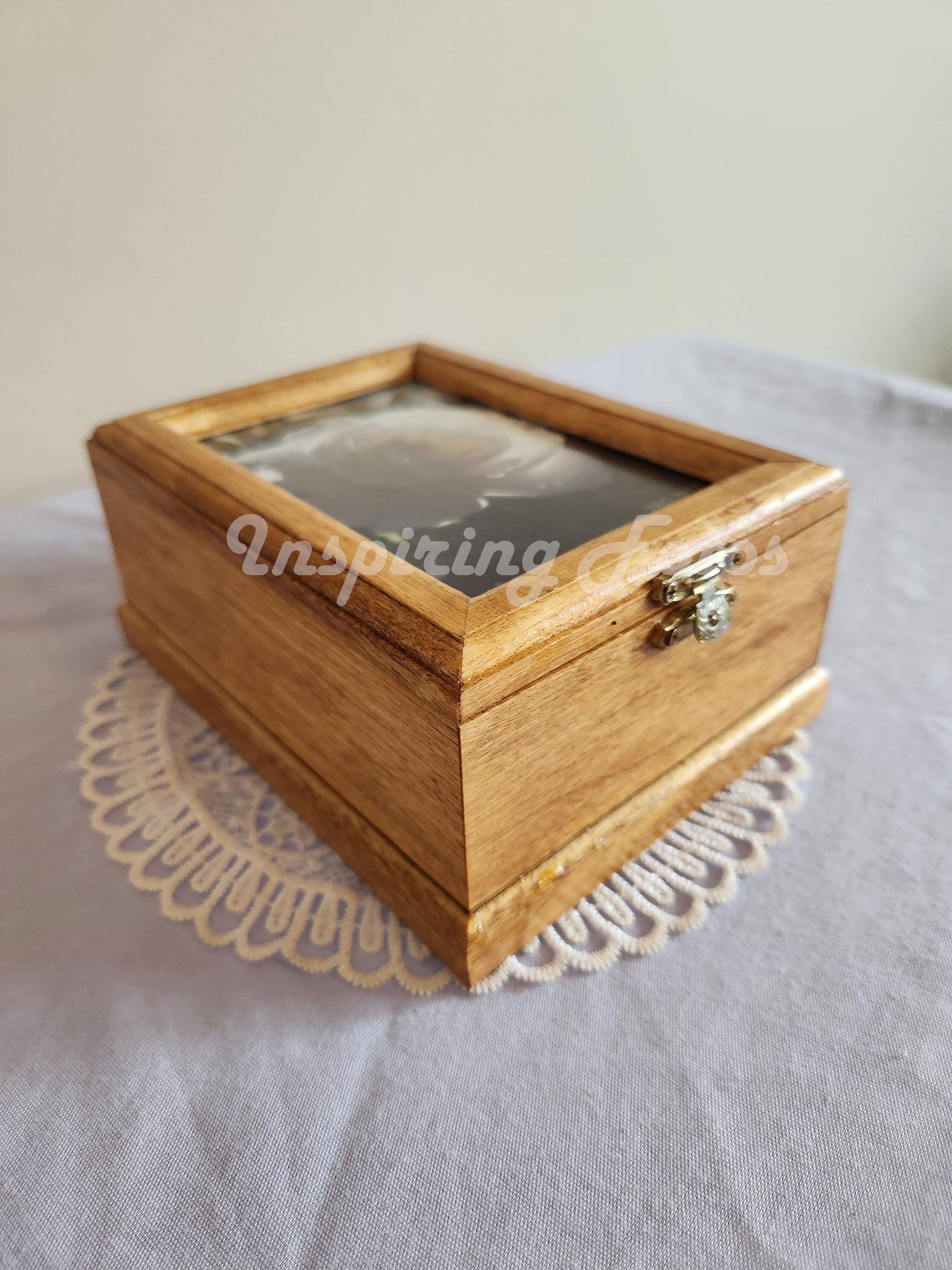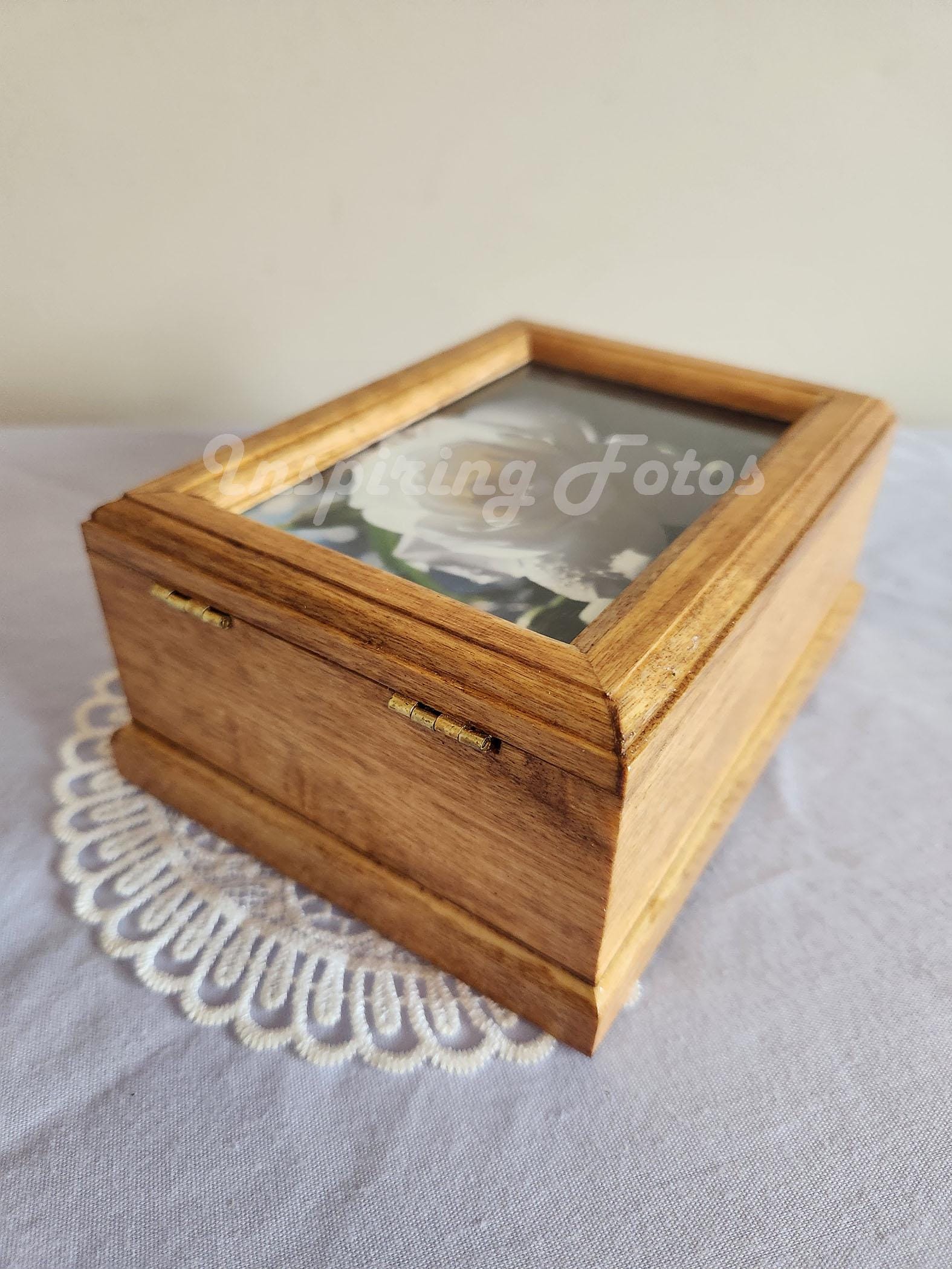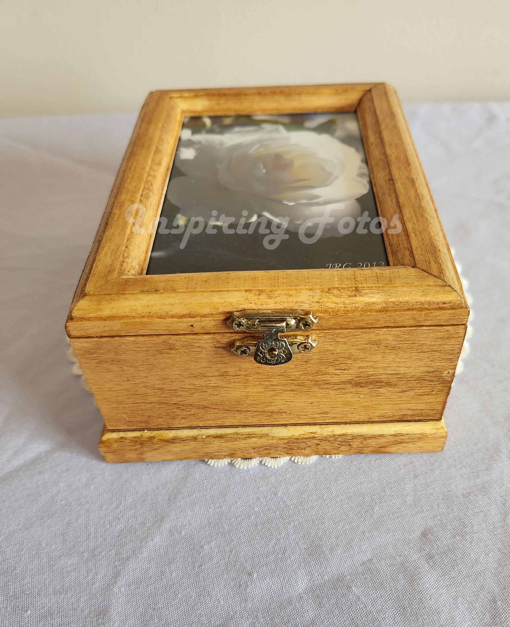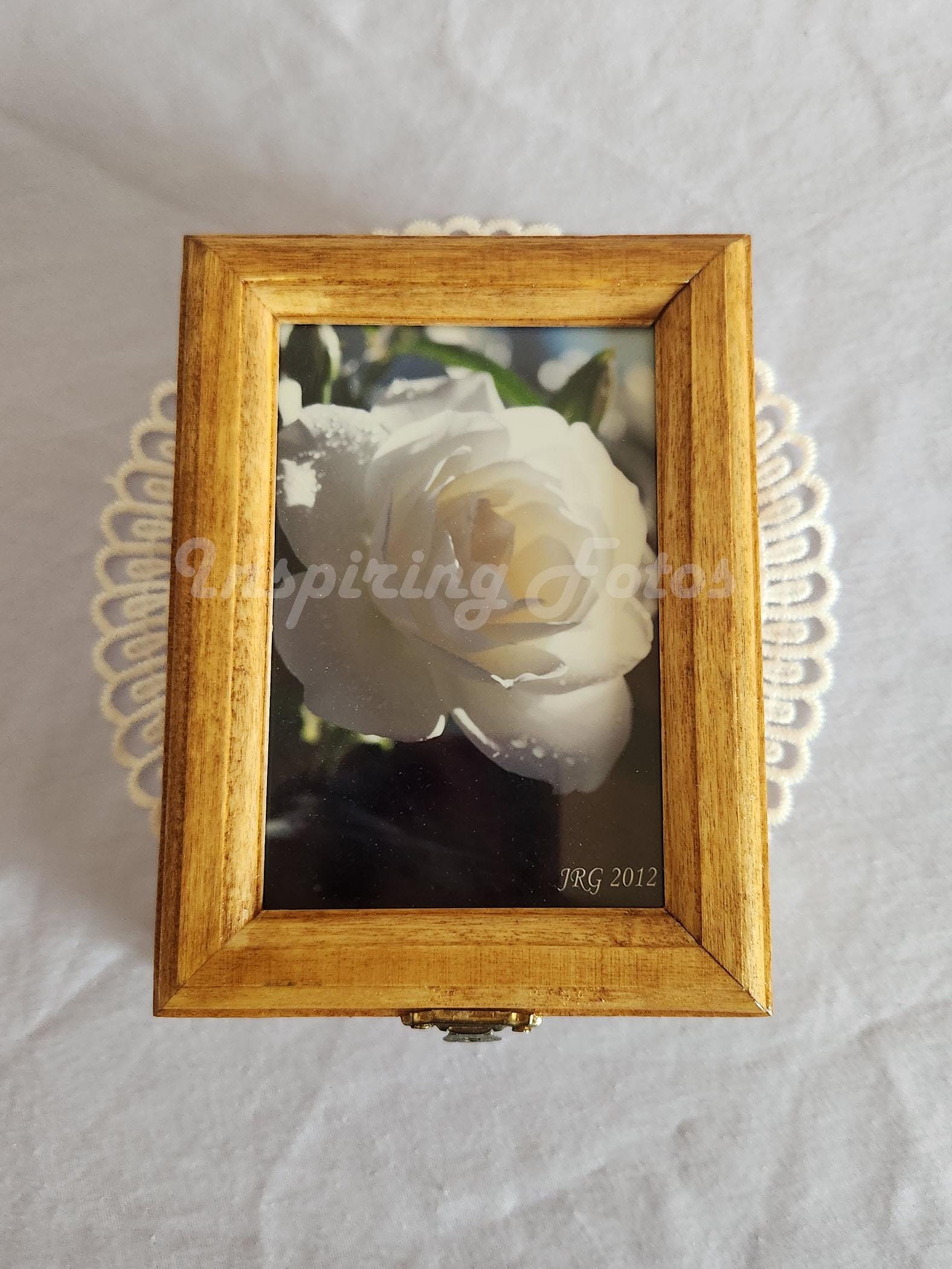This photo trinket box is part of the Touch of Roses collection. This hand-stained photo box is 6 1/4 x 5 x 2 1/2- inches has a photo of an Iceberg Rose on the top of the box. The inside of this wooden photo box is lined with green felt and can be used to store small trinkets or used as a small jewelry box. This photo box is a great gift for a teenager, friend, or family member. Note: Jewelry shown in photo not included but can be purchased in the jewelry section.