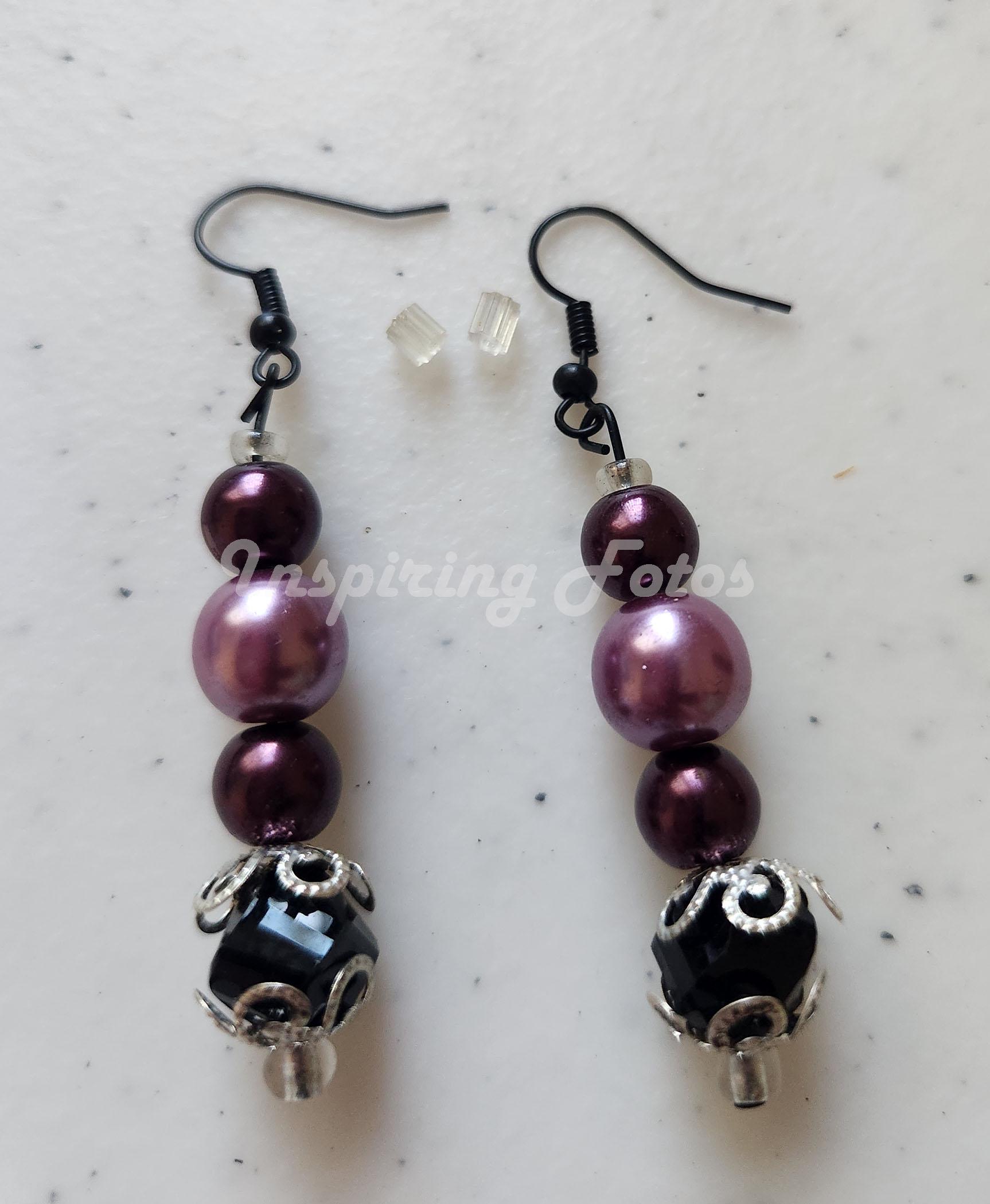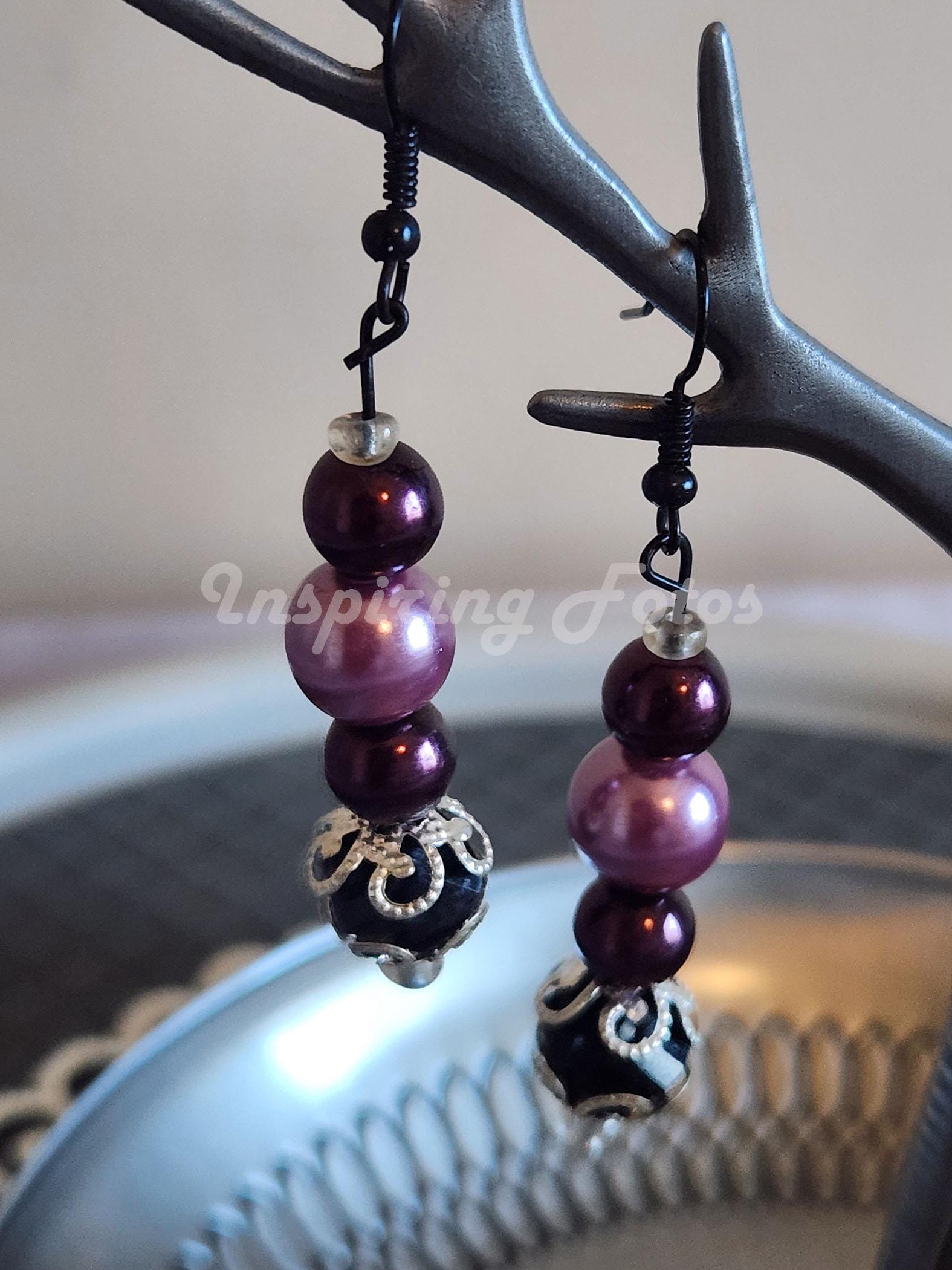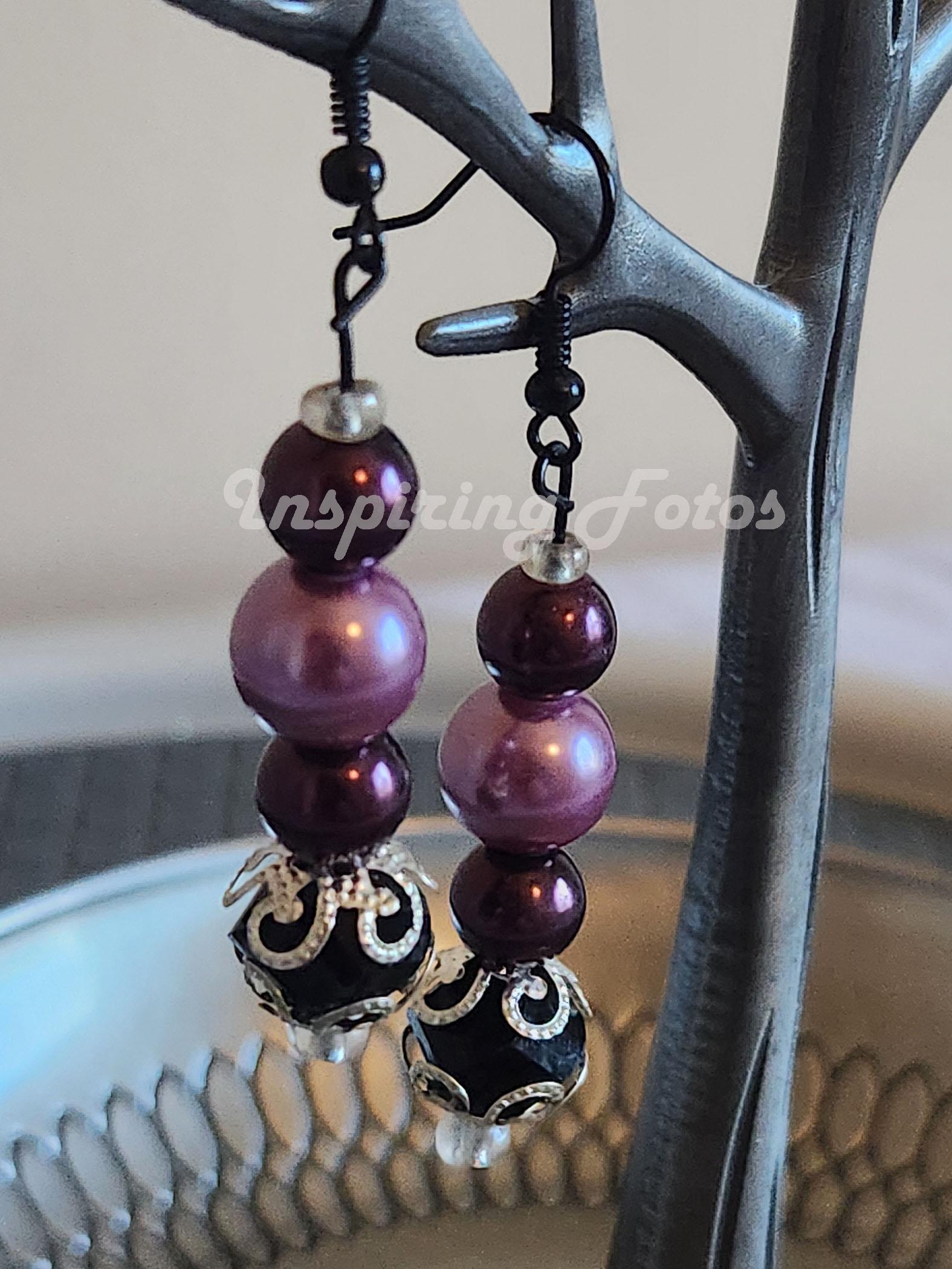 This pair of 2-inch glass bead drop earrings are part of the Touch of Jewelry collection. These drop earrings are made with burgundy, purple and black with metal caps glass beads. Matching necklace is sold separately in the jewelry section.