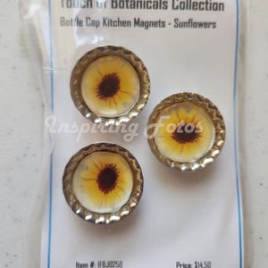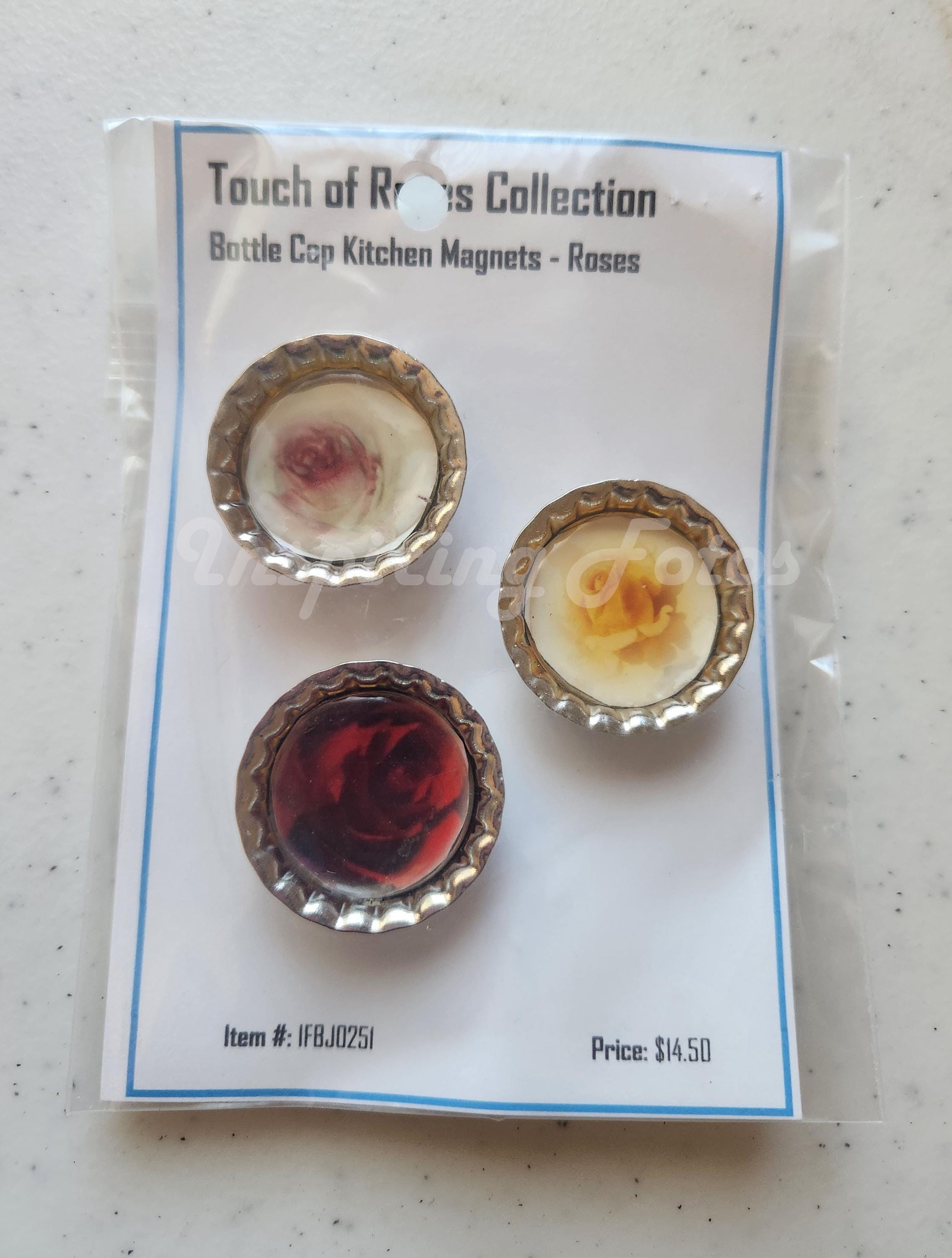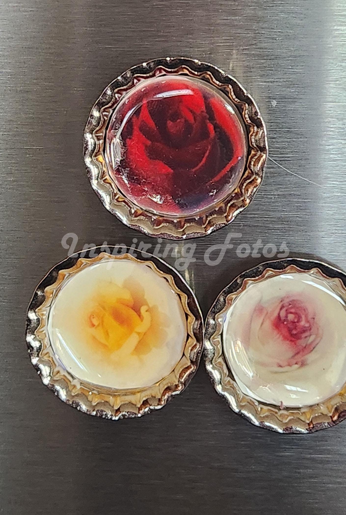 This set of 3 bottle cap magnets are part of the Touch of Roses collection. These 30 mm silver bottle caps each have a photo of a rose (yellow, multi-color, and red). These magnets are great to hang messages, recipes, family photos or children’s drawings on your kitchen refrigerator. This is a great gift for any occasion.