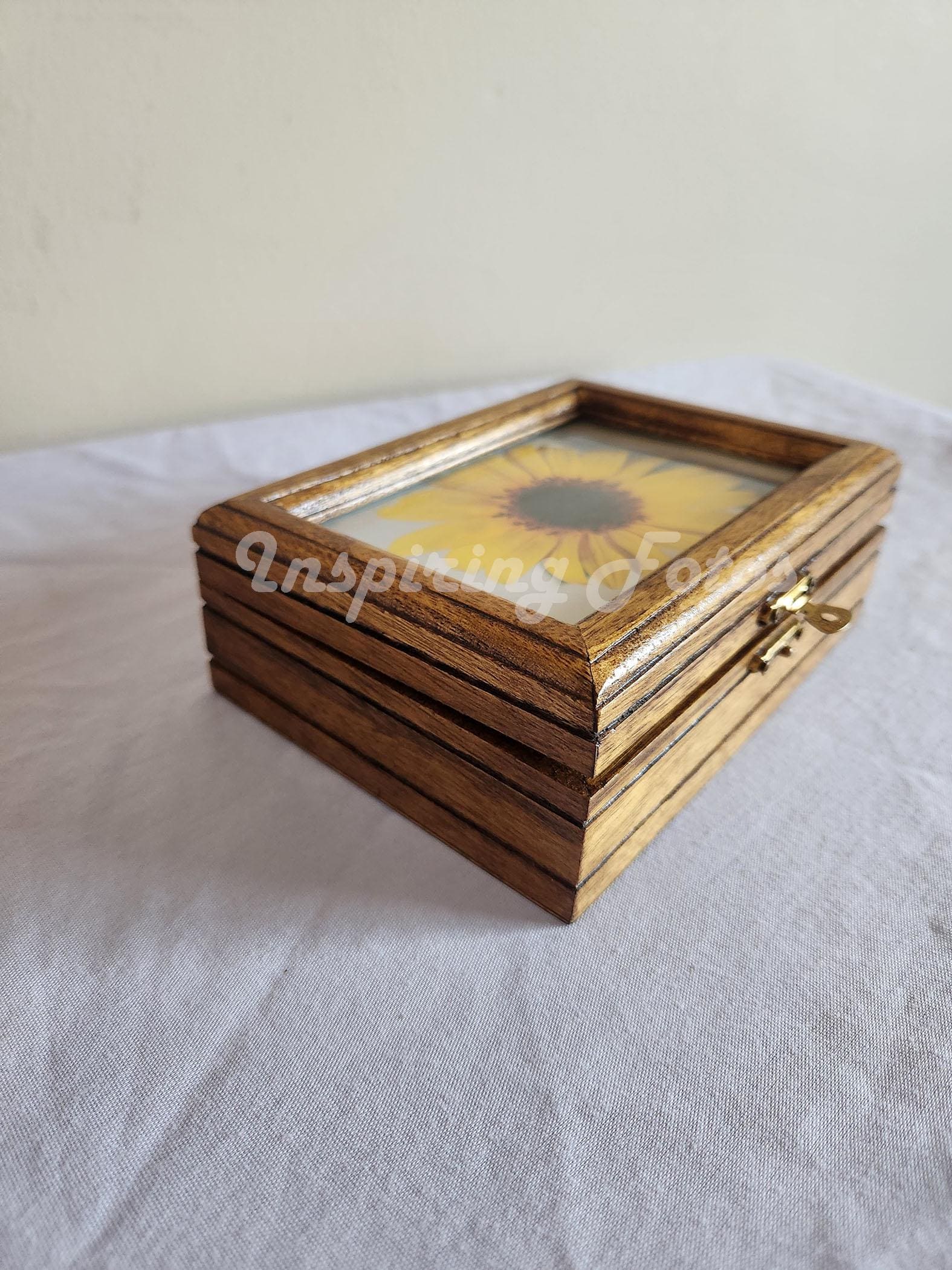 This hand-stained photo trinket box is part of the Touch of Botanicals Collection. This 6 x 4 1/2 x 2 inches is lined with a green felt bottom inside box and photo of a sunflower on top of box. This will be a wonderful addition to any teenager's room or gift for the holidays. Note: Jewelry in photo is not included is display only but will be available for sale in the jewelry section.