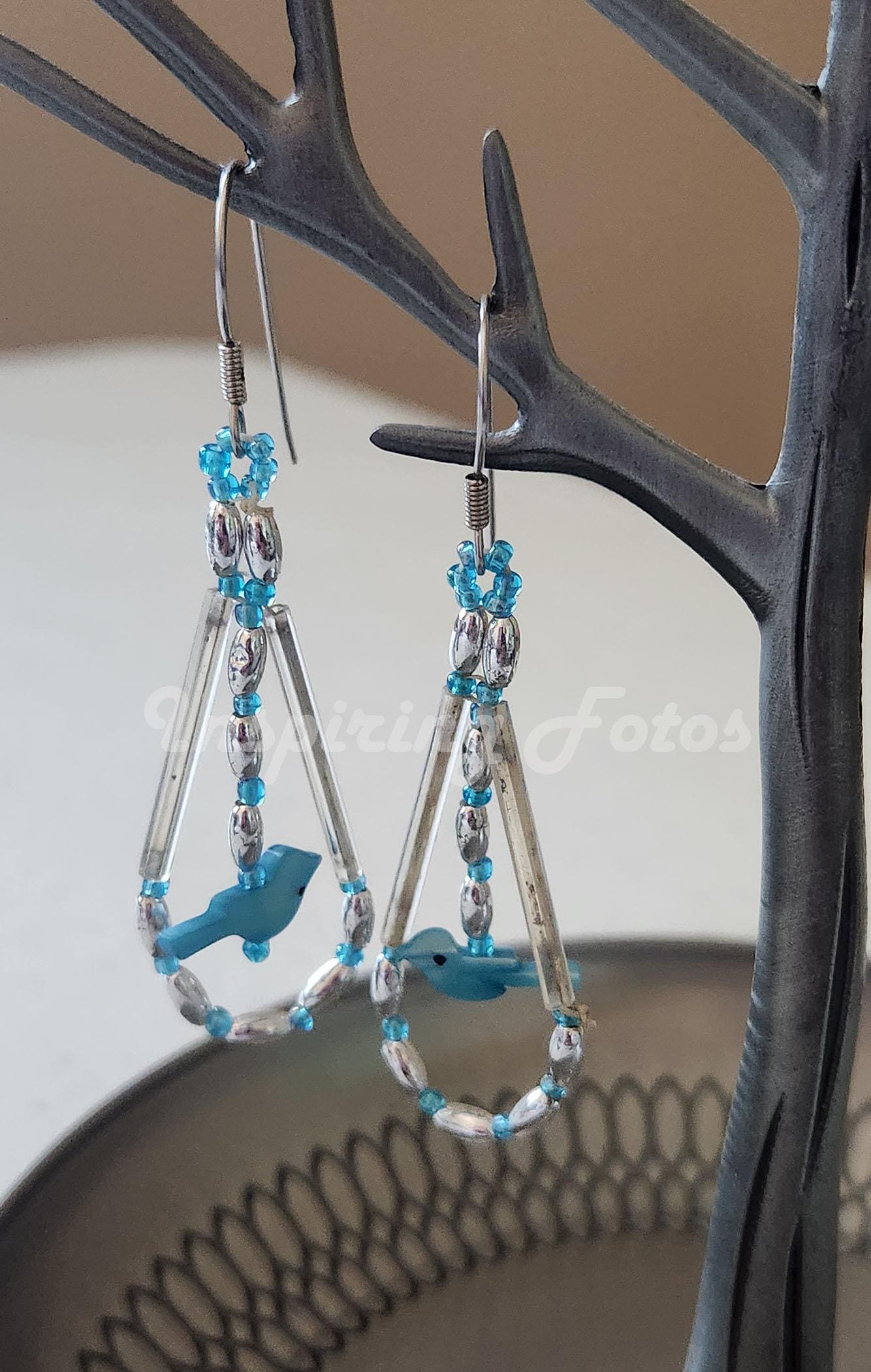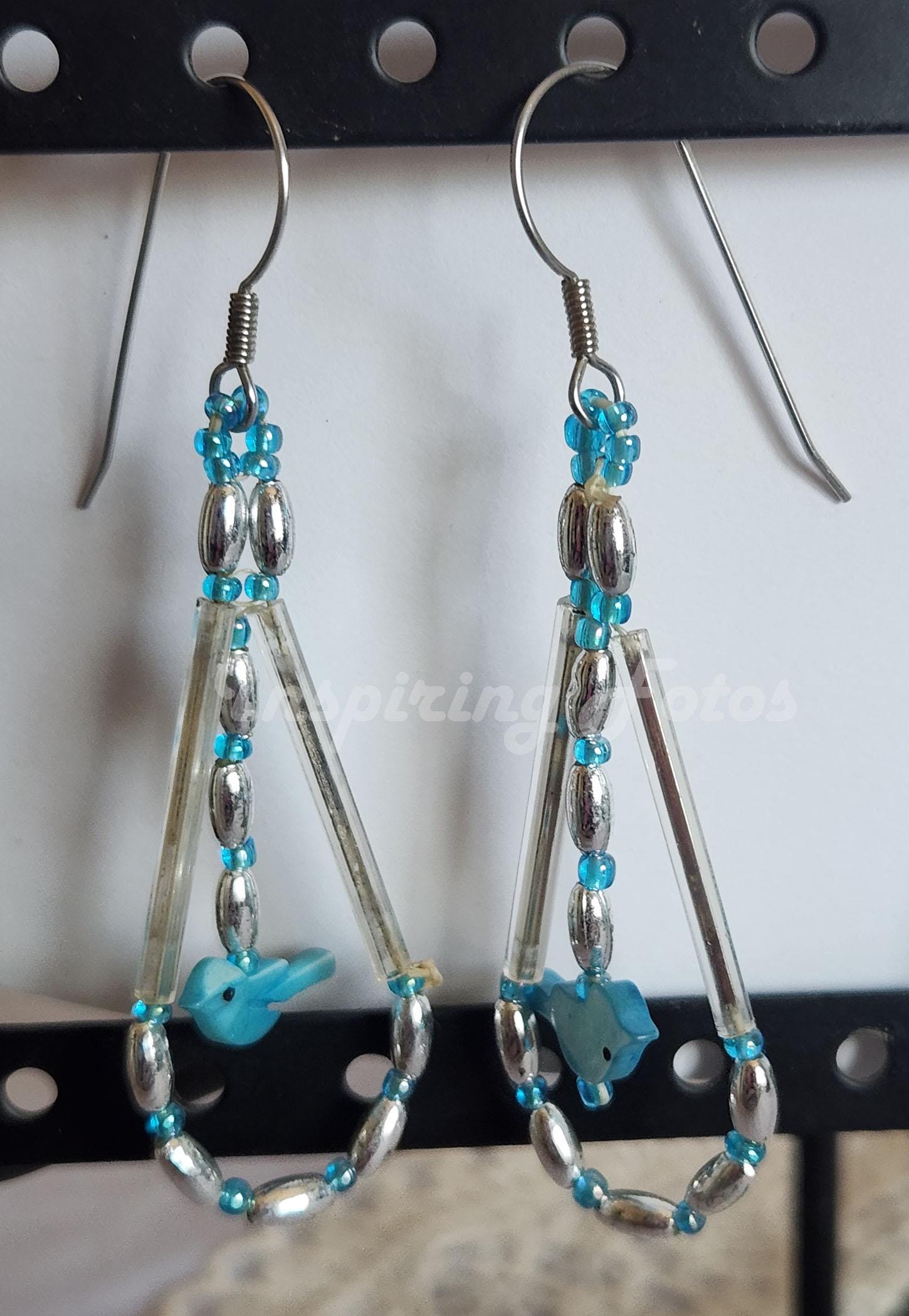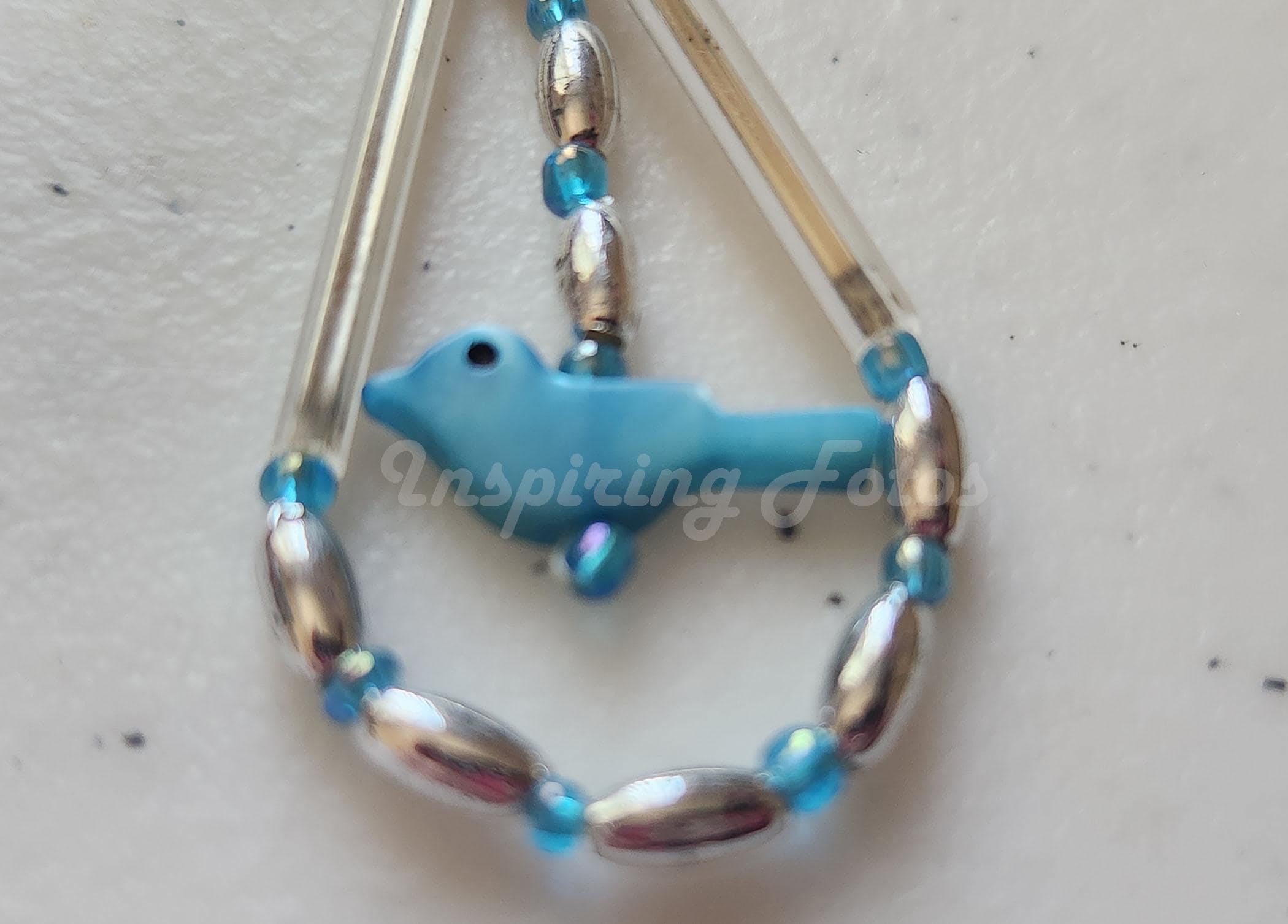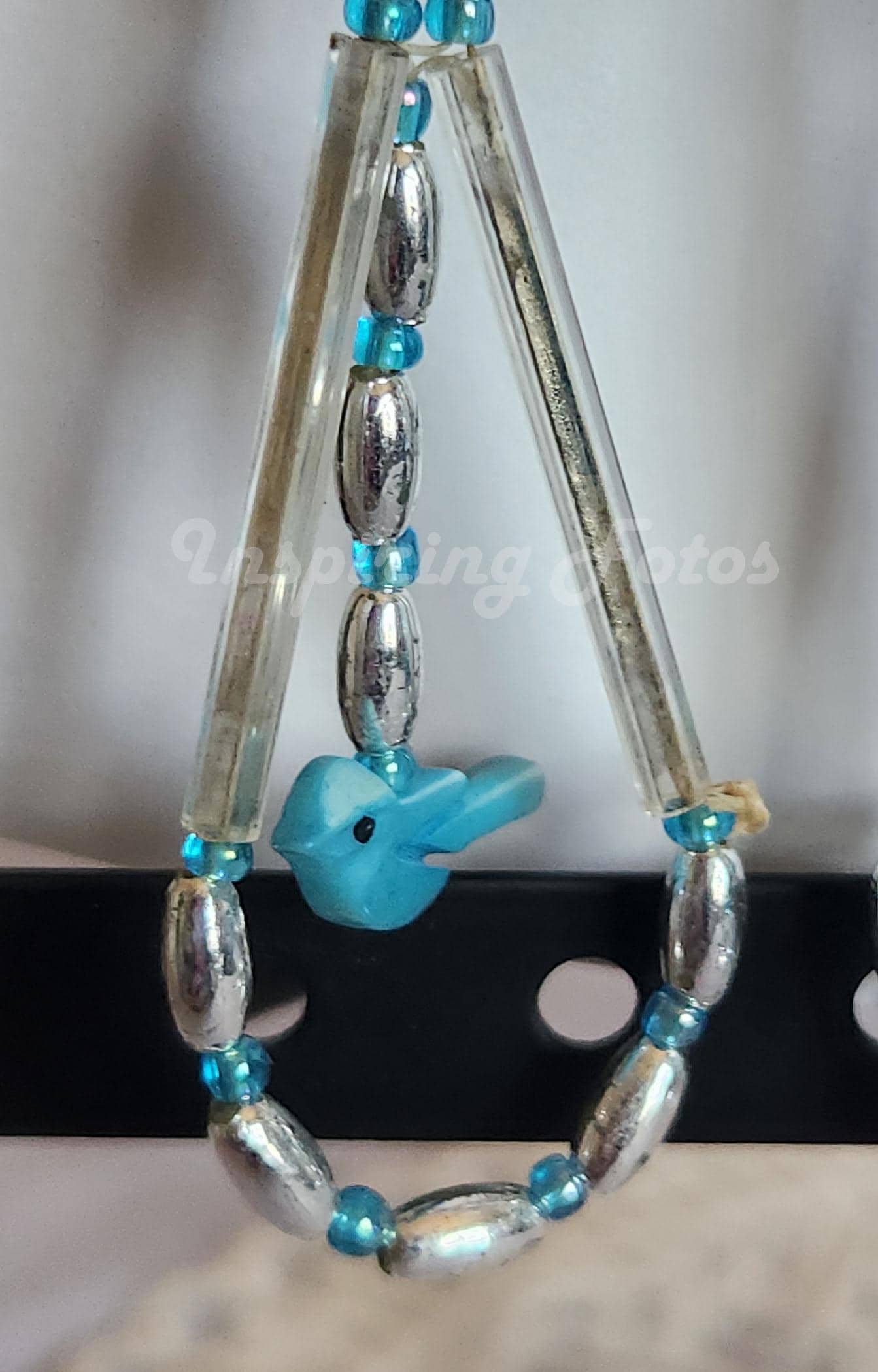 This pair of beaded teardrop earrings are part of the Touch of Jewelry collection. These are a 2 inch hand beaded dangle earrings are made with silver bugle and oval beads, blue seed beads and a turquoise bird bead hanging from the center of the teardrop. Perfect gift for any occasion (i.e. Birthday, Christmas, etc.).
