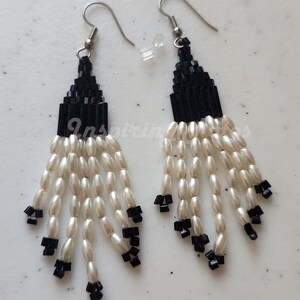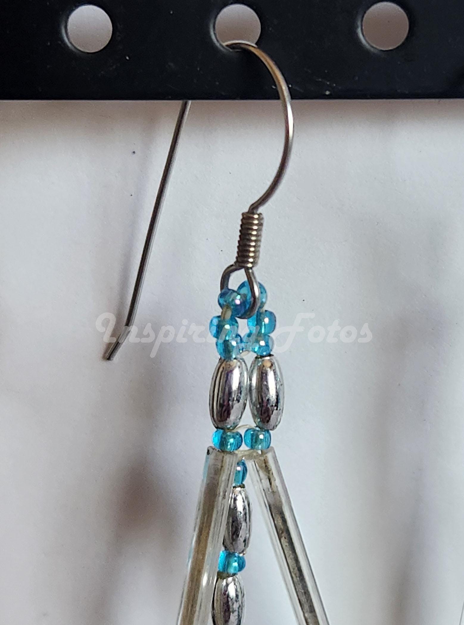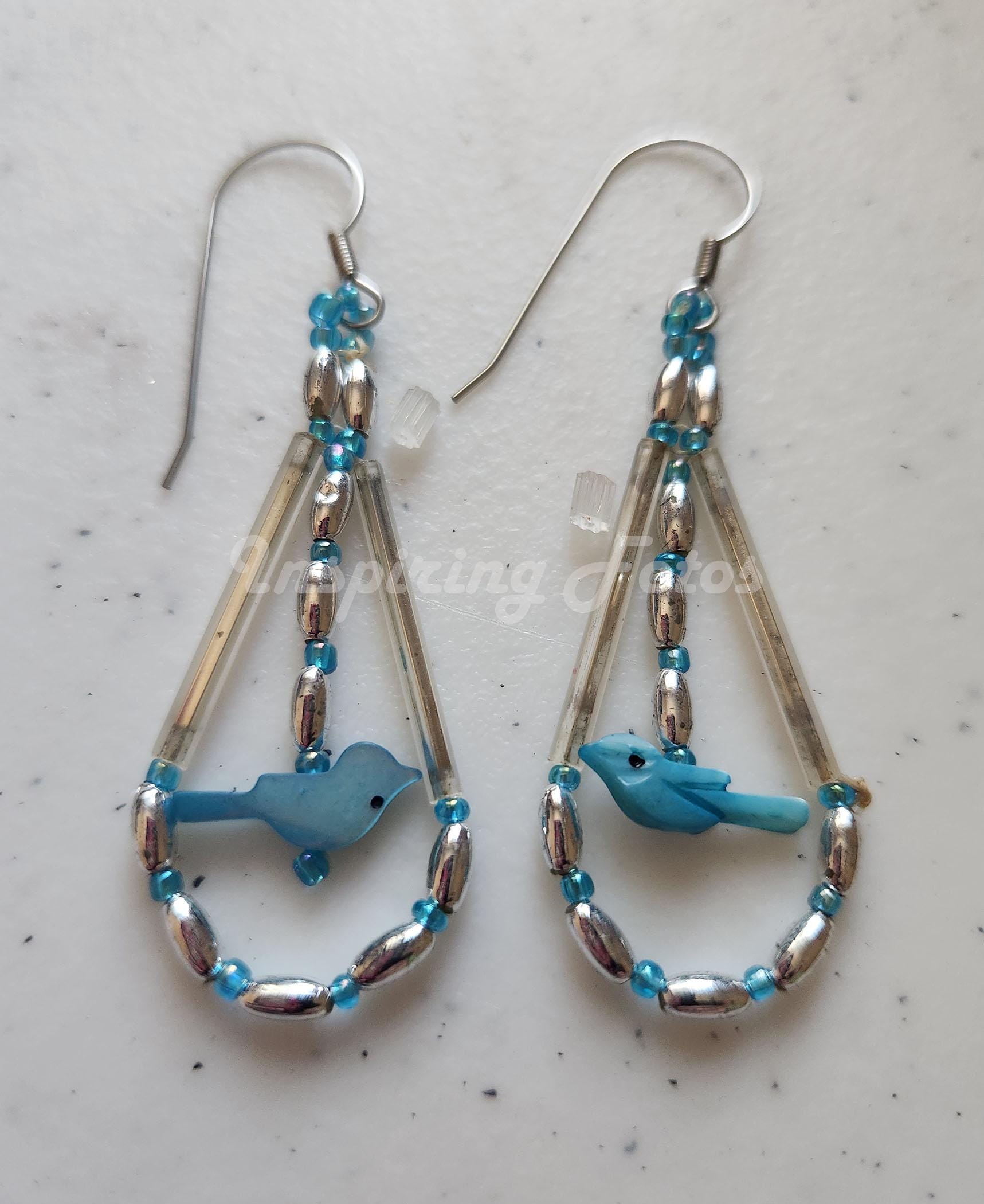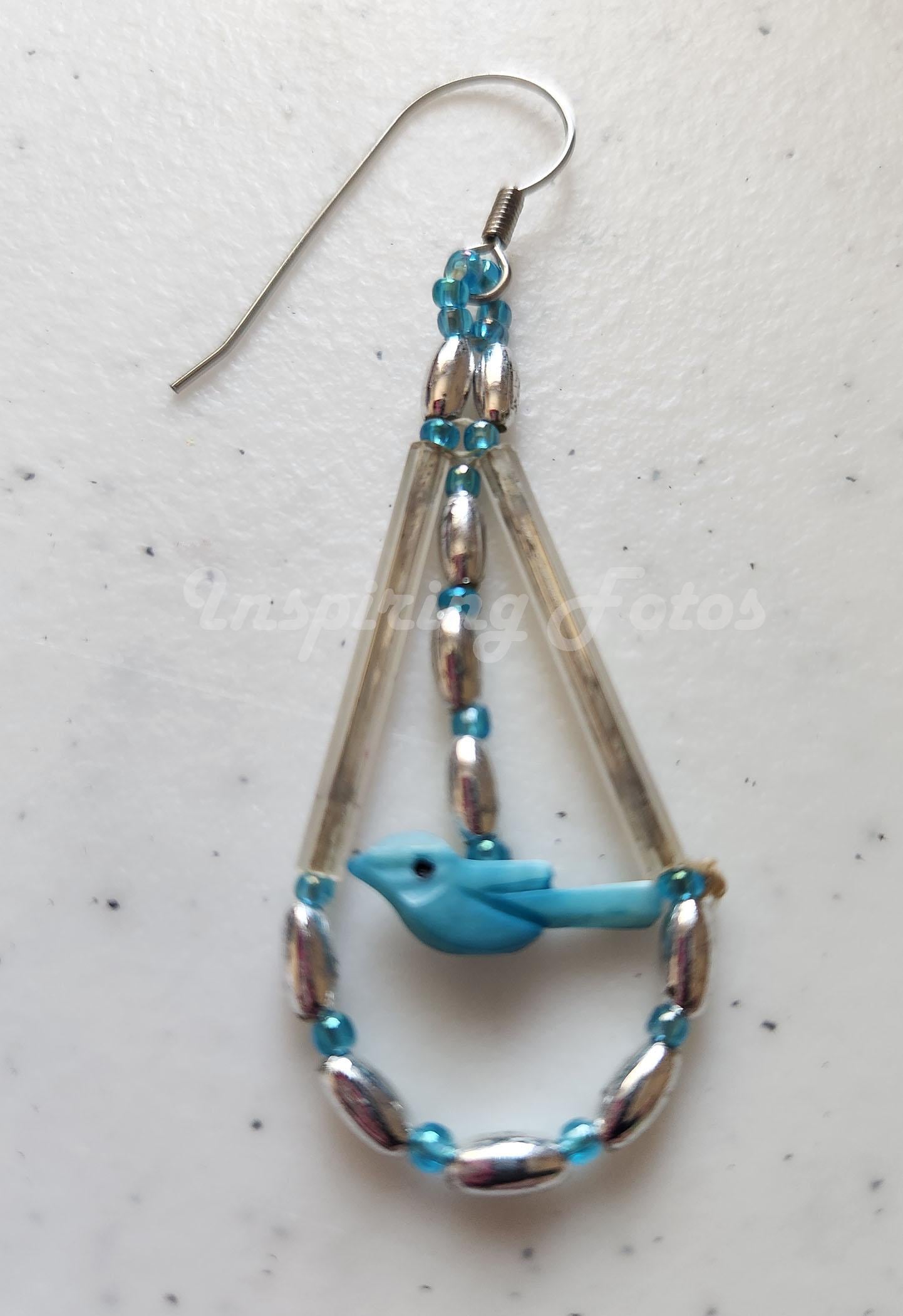 This pair of beaded teardrop earrings are part of the Touch of Jewelry collection. These are a 2 inch hand beaded dangle earrings are made with silver bugle and oval beads, blue seed beads and a turquoise bird bead hanging from the center of the teardrop. Perfect gift for any occasion (i.e. Birthday, Christmas, etc.).