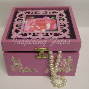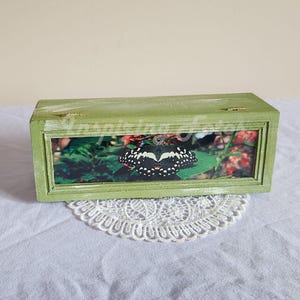 This frame is part of the Touch of Botanical collection. This is a 6 1/2 x 8 1/2 inch decoupage light wood-stained frame with a 4 x 6 inch photo of a red hibiscus flower. This frame can either stand on a table or hang on the wall. This red hibiscus photo was taken in Tucson, AZ. This frame was hand sanded and stained.